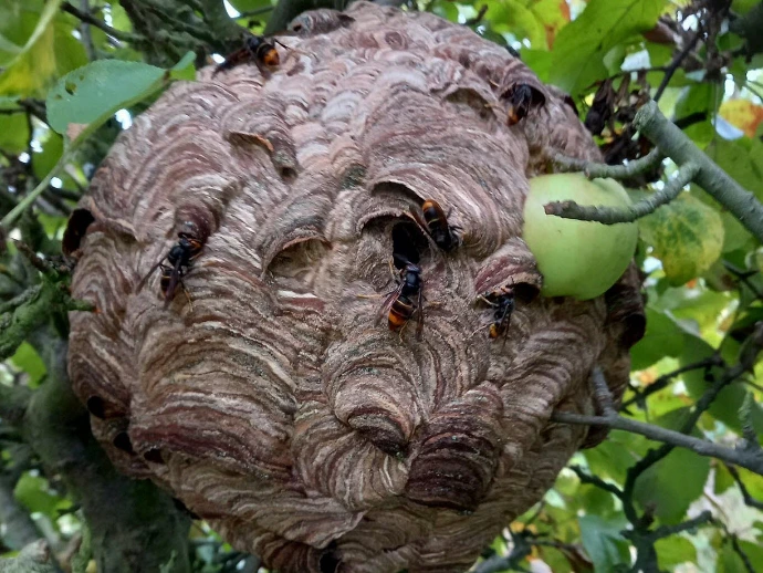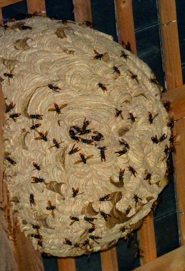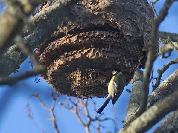 - Nids en papier mâché sphériques en hauteur (dans les arbres) ou parfois dans les bâtiments